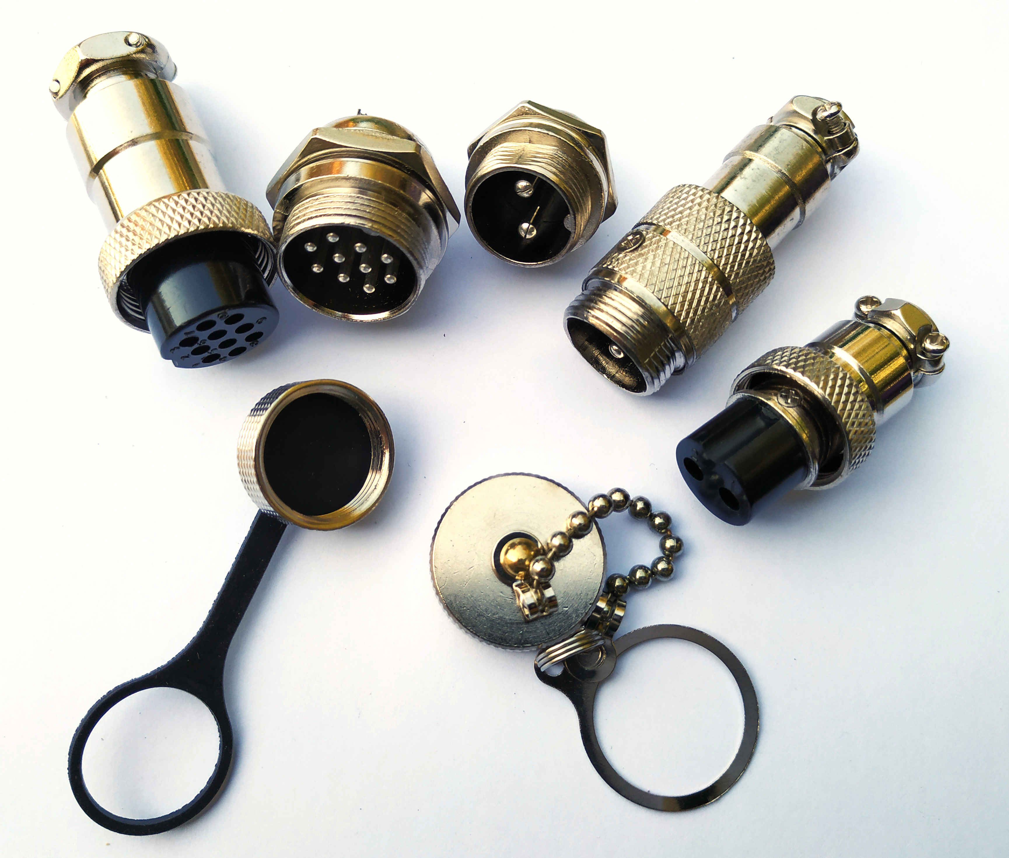 Connectors of type GX-16 and GX-20 are quite large. They are useful for connecting a cable harness with both signal and (limited) current wires. However, they are best known for connecting to a charger. Pin diameters vary, depending on how many pins the connector is. For each pin it is advisable not to transport more than 5 A. A four-pin connection can therefore be used in combination with a 10 A charger, larger pins can transport 7 A. In that case GX-20 is more obvious than GX-16. The number can be used as diameter for holes, but the thread for GX-16 and GX-20 is M16 * 1 and M19 * 1 respectively.
