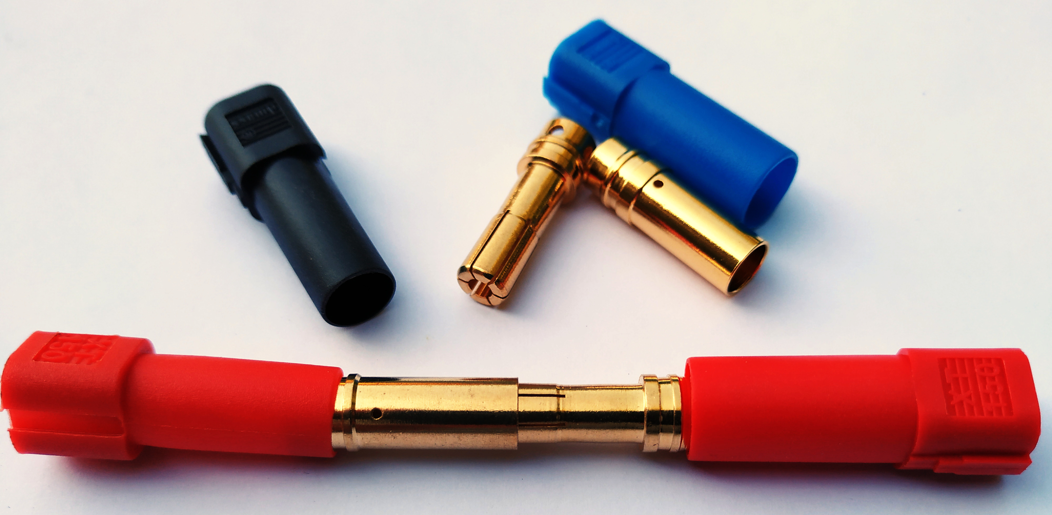 They are popular, they are cheap and able to conduct impressive currents. Types are from small to big: XT30, XT60, XT90 and XT150. The number is the maximum current. XT150 is a single pole connector, see banana's below. The smaller ones are + and - connectors. XT90 knows a variant with spark protection and it is advised to use that one. Tip: When soldering, first connect male and female. This way the warm pins stay better aligned by the cold pins. Solder quickly.