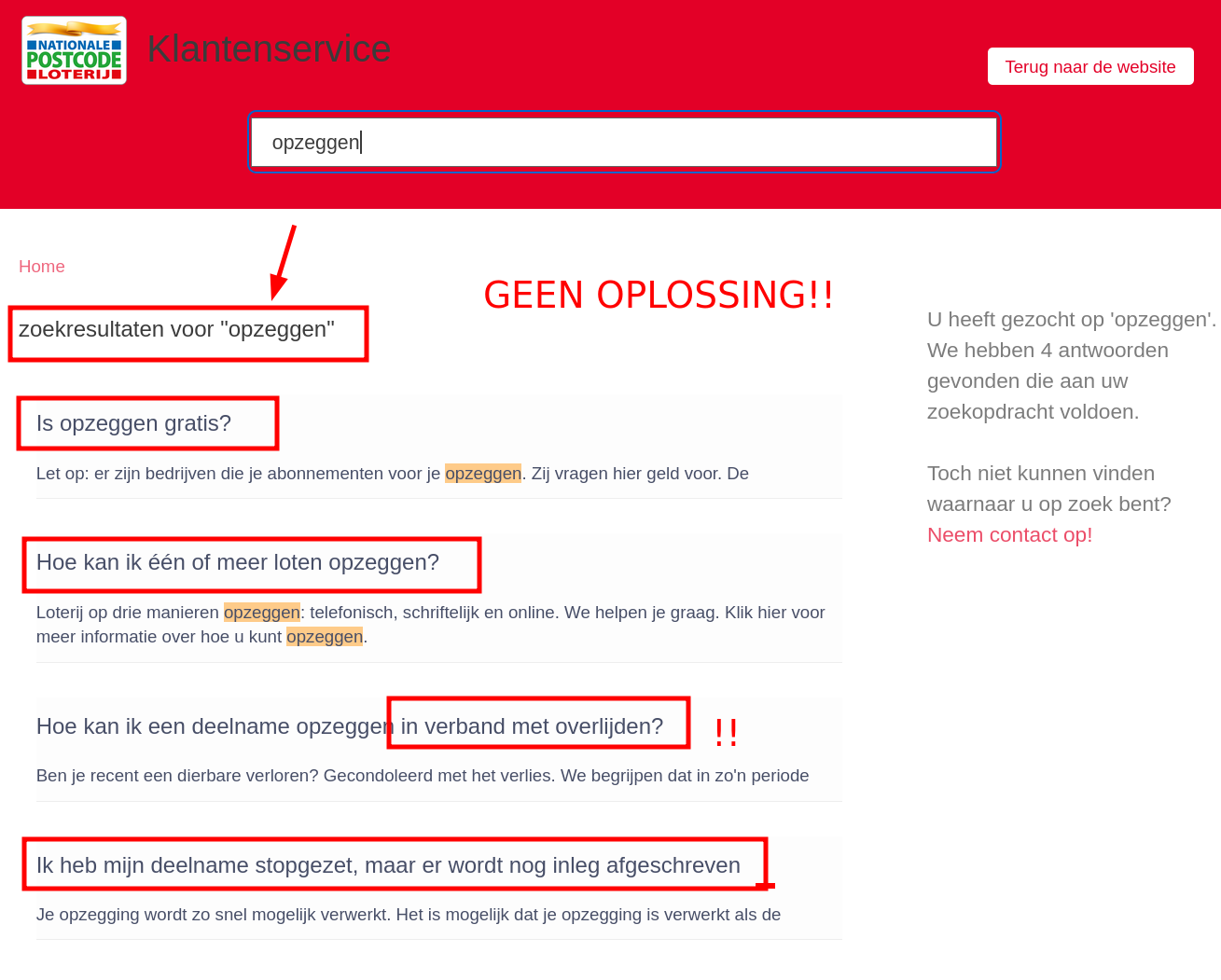 Zodra je bent ingelogd, begint het spelletje. Je zoekt op "opzeggen" en krijgt een reeks keurige veelgestelde vragen:
